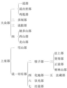 自佛弟子结集佛教经典,经、律、论等三藏,成为佛教学说的法库总汇以来,在三藏经典中,其实也已大部分包罗收藏了印度教哲学,和一般学术上的思想体系。我们如果认定《大藏经》为纯佛法或佛学的,那就未免太过拘囿或小见了。不管佛经三藏的结集,在佛教史上有如何的争议,我们至少可以确信自佛灭度一百年后开始,直到四百年之间,佛的遗教弟子,因所执持的学说,及师承或见解的异同,渐已分化而有派别,初由大众、上座两部,经过三、四百年来的演变,就形成了当时印度佛教的部派,归纳起来约有十八至三十余部之多,其学派名称有如下列: