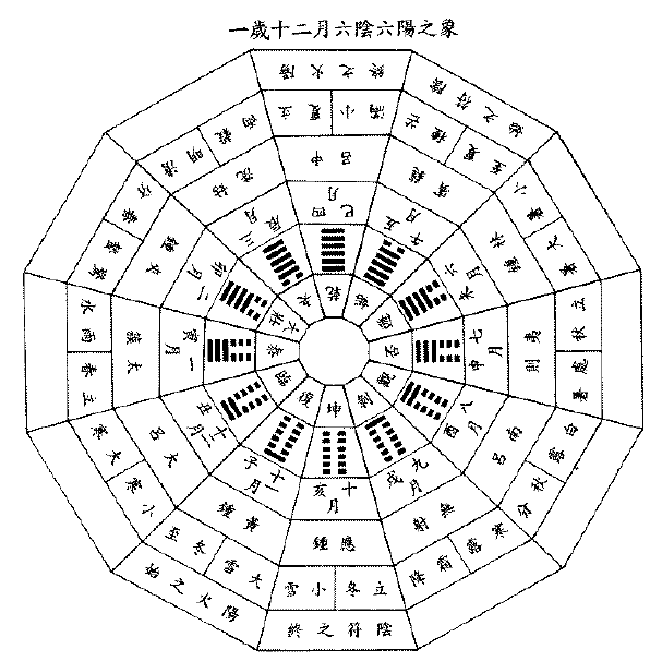 我们看一层一层的圏圈,共有六层,中间是空的,这个空的外面第一层是十二个卦,专门名词叫做十二辟卦,辟卦也叫做侯卦。中国上古的政治,中央政府的皇帝称为天子,天子只有一个;地方的领袖是王,叫诸侯,侯卦的意思就是臣卦。在时间上说,一年是个主体,分十二个月,十二个卦名分别代表十二个月,叫十二辟卦。再外一圈是卦象,这个卦一笔一笔怎么画法?我们慢慢也要解释一下。第四圈是中国阴历十二个月份,每一个月另有一个代号,就是子、丑、寅、卯、辰、巳、午、未、申、酉、戌、亥。