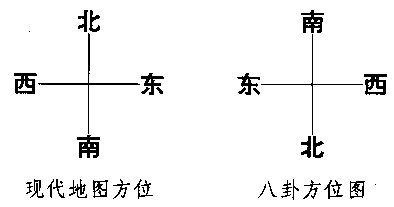 八卦的图案,乾卦代表天在上,坤卦代表地在下,画出来就是前面伏羲八卦的先天图,它的方位,和现代我们所用地图,上为北方、下为南方的情形,恰恰相反。八卦的方位,上面是南方,下面则是北方,它的图是这样的: