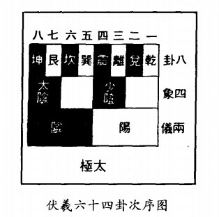 你说这个人好好的,他的胃生病,那个太极已经出了问题。所以万物各有一太极,移形换步。没有动以前,什么都没有,还是一太极,一动便成了两仪,“阴”与“阳”。譬如我的手不动便没有事,一动就有阴有阳,有了阴阳就生四象:老阴、少阴、老阳、少阳四个现象。什么是老?就是到了极点,老啦,太老就要变。老就要再生些年轻的,因之又有了少。老阴老阳、少阴少阳,四象就生出八卦,八个现象就这么来了。我们从伏羲六十四卦次序图下面看,横图下面是白的,什么都没有,那就是太极。一动就生阴阳,就有黑白,再上面一层就生四象,四象就变八卦,八卦就变化出来六十四卦。